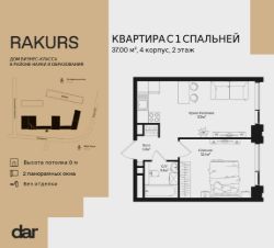 Продаётся 1-комнатная квартира 37.00 м² в жилом комплексе Ракурс. Квартиру отличают панорамное остекление, потолки [ceiling_height] м, улучшенная шумо и воздухоизоляция. Дом сдаётся в 1 квартале 2028 года, продажи проходят через эскроусчета. Подземный паркинг, коворкинг, закрытая благоустроенная территория с фонтаном и артобъектами. Гибкие условия покупки.