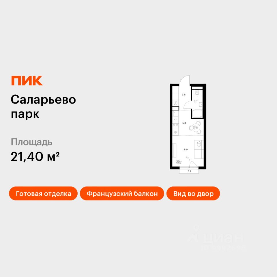 Продаётся квартира-студия площадью 21,4 кв.м на 13 этаже 18 этажного дома (Корпус 74.1, Секция 1) проекта ПИК Саларьево парк. Светлый просторный подъезд на уровне земли, функциональная планировка, большие окна, c отделкой.