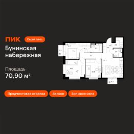 Продаётся 3-комн. квартира площадью 70,9 кв.м на 12 этаже 16 этажного дома (Корпус 2.6/1.2, Секция 2) проекта ПИК Бунинская набережная. Светлый просторный подъезд на уровне земли, функциональная планировка, большие окна, предчистовая отделка.