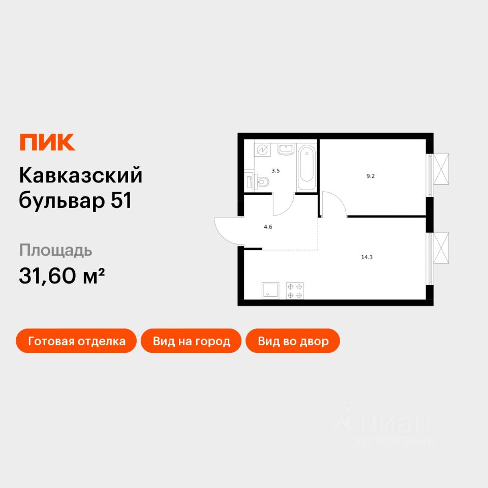 Продаётся 1-комн. квартира площадью 31,6 кв.м на 17 этаже 23 этажного дома (Корпус 1.6, Секция 2) проекта ПИК Кавказский бульвар 51. Светлый просторный подъезд на уровне земли, функциональная планировка, большие окна, c отделкой.