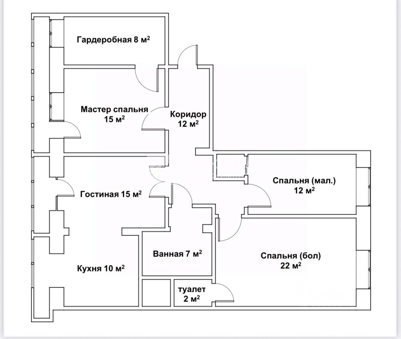 - мастер-спальня (15 кв.м.) с оборудованной гардеробной комнатой (8 кв.м.)