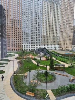 На фото вид на квартиру со двора (высокий третий этаж) и из квартиры во двор. Кафе, пекарни, аптеки и бьютисалоны на первых этажах корпусов.