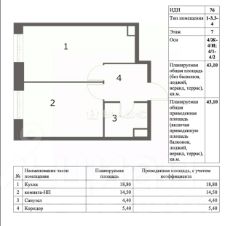 Квартира расположена на 7 этаже 19-этажного монолитного дома, СРОК ВЫДАЧИ КЛЮЧЕЙ КОНЕЦ 2025 ГОДА. Общая площадь — 43,1 кв. м, высота потолков — 3,3 м. Жилая площадь составляет 14,5 кв. м, площадь кухни — 18,8 кв. м. Окна выходят не на жд пути. В квартире есть совмещённый санузел.