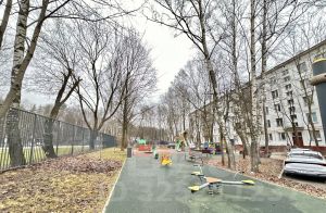 Благоустроенная придомовая территория с детской площадкой и спортивной.