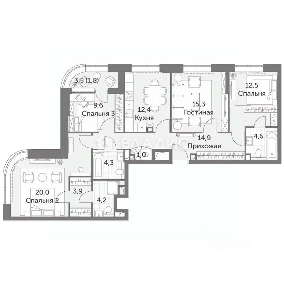 Общая площадь - 104,5м2, из которых: вместительная кухня - 12,4 м2, которую можно объединить с соседней комнатой - 15,3м2; комната с мастер-спальней - 17,1м2; комната с угловой лоджией - 13,1м2; угловая комната с мастер-спальней и своей гардеробной - 28,1м2; один общий совмещенный санузел - 4,3м2; просторный коридор с кладовой - 15,9м2.