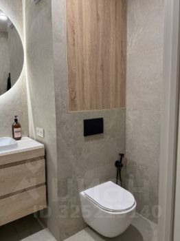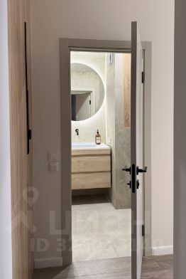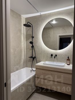 - в ванне подсветки, теплый пол, полотенцесушитель и огромное зеркало с тумбой, что удобно для хранения, а над инсталляцией коммуникации скрыты за шкафом.