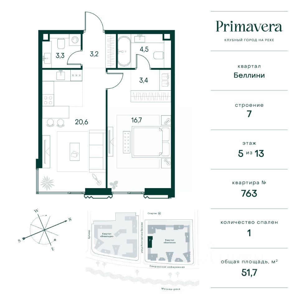 Клубный город на реке Primavera — это современный жилой комплекс премиум-класса, расположенный на первой береговой линии Москвы-реки в экологически чистом районе Покровское-Стрешнево. Под панорамными окнами квартир находится собственный экопарк с продуманной сетью прогулочных дорожек и современными детскими и спортивными площадками. За парком расположена набережная с собственным пляжем и зонами для отдыха. Клубный город на реке Primavera предлагает широкий выбор планировок для различных жизненных сценариев: от просторных однокомнатных квартир до пентхаусов и жилых помещений с террасами и патио. Выберите из 120 вариантов эргономичных планировок стандартного и евроформата. Из каждой квартиры открываются красивые виды на реку с углом обзора в 270 градусов. Дизайнерские лобби предлагают панорамный обзор на благоустроенный двор. Высокие потолки в 6 метров и качественная отделка создают атмосферу, схожую с пятизвездочными отелями. В Primavera есть всё необходимое для комфортной жизни в мегаполисе: • Образование для детей в шаговой доступности: 4 школы, 8 детских садов и развивающие центры с кружками и секциями. • Удобства на расстоянии приятной прогулки: супермаркеты, кафе, рестораны с верандами, салоны красоты, аптеки и многофункциональный центр для шоппинга и развлечений. • Умный дом: автоматизированное бесконтактное управление основными системами доступа и безопасности через мобильное приложение. Клубный город на реке Primavera выгодно сочетает комфорт городской жизни с близостью к природе. Живите в месте, где все создано для вашего удобства!