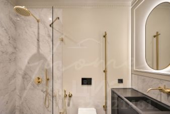 Стиль — вневременная неоклассика, дополненная акцентами ар-деко и благородными оттенками натурального дерева. Интерьер создан как идеальный фон для ярких элементов декора и персонального стиля будущих владельцев.