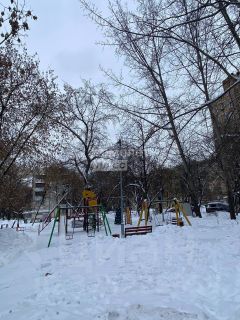 Во дворе детская площадка, хоккейная коробка и спорт площадка.