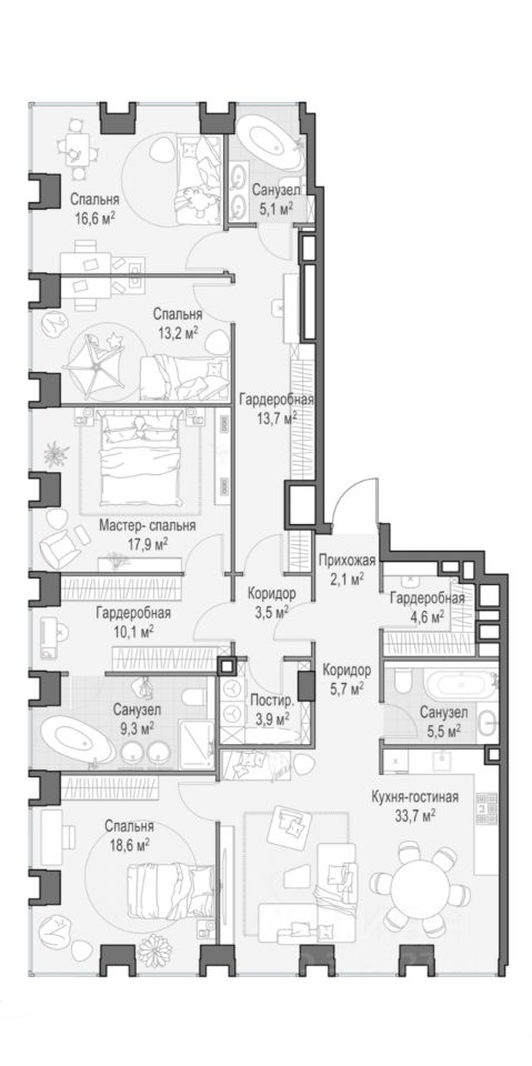 В квартире можно разместить просторную кухню-гостиную, мастер-спальню с собственной ванной комнатой и гардеробной, 3 спальни, 2 санузла, две гардеробные, постирочную и холл. На фотографии представлено возможное планировочное решение.