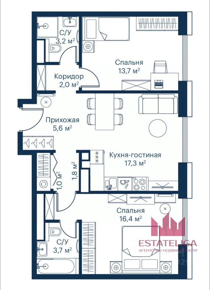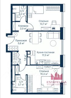 По планировке - 2 изолированные спальни + большая кухня-гостиная.