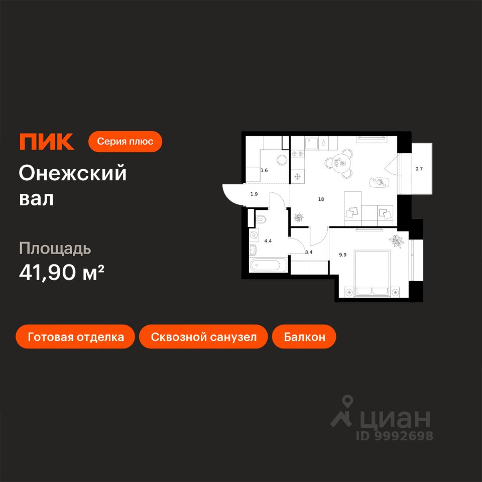 Продаётся 1-комн. квартира площадью 41,9 кв.м на 7 этаже 23 этажного дома (Корпус 1.1.1, Секция 1) проекта ПИК Онежский вал. Светлый просторный подъезд на уровне земли, функциональная планировка, большие окна, c отделкой.