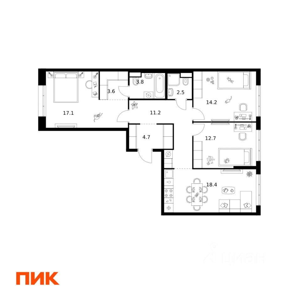 Продаётся 3-комн. квартира площадью 88,2 кв.м на 6 этаже 12 этажного дома (Корпус 2.3, Секция 4) проекта ПИК Москворечье. Светлый просторный подъезд на уровне земли, функциональная планировка, большие окна, c отделкой.