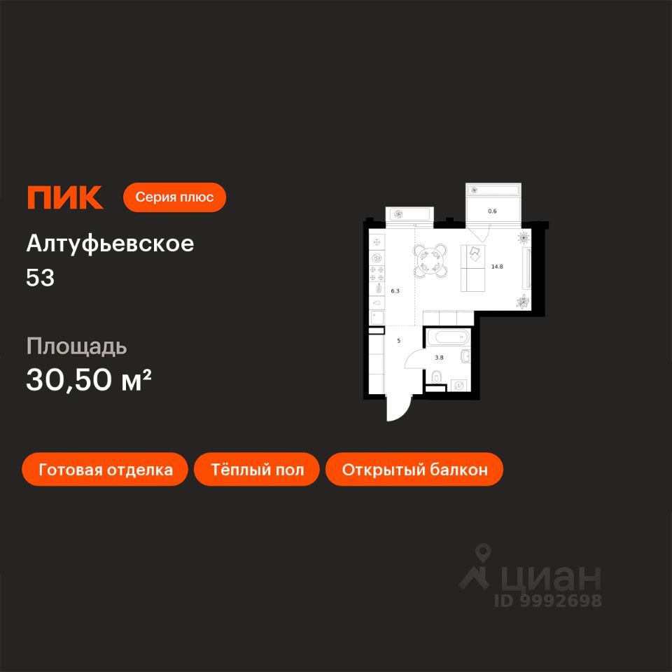 Продаётся квартира-студия площадью 30,5 кв.м на 3 этаже 32 этажного дома (Корпус 1.1, Секция 4) проекта ПИК Алтуфьевское 53. Светлый просторный подъезд на уровне земли, функциональная планировка, большие окна, c отделкой.