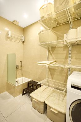 Отдельное помещение для стирки и сушки, где имеется шкаф с системой автоматического глажения и место для хранения бытового инвентаря.
