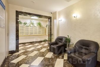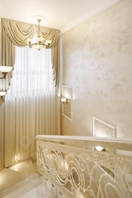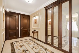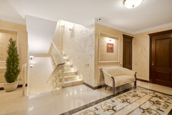 При входе в квартиру мы оказываемся на среднем этаже в просторной прихожей с большой гардеробной для верхней одежды, удобным диваном и банкетками.