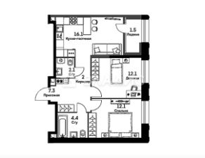 - Площадь кухни: 16,1 кв. м.