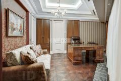 Планировка включает просторную кухню-гостиную с обеденной зоной и панорамными окнами, две мастер-спальни с собственными ванными комнатами и гардеробными, кабинет, постирочную, гостевой санузел и холл.