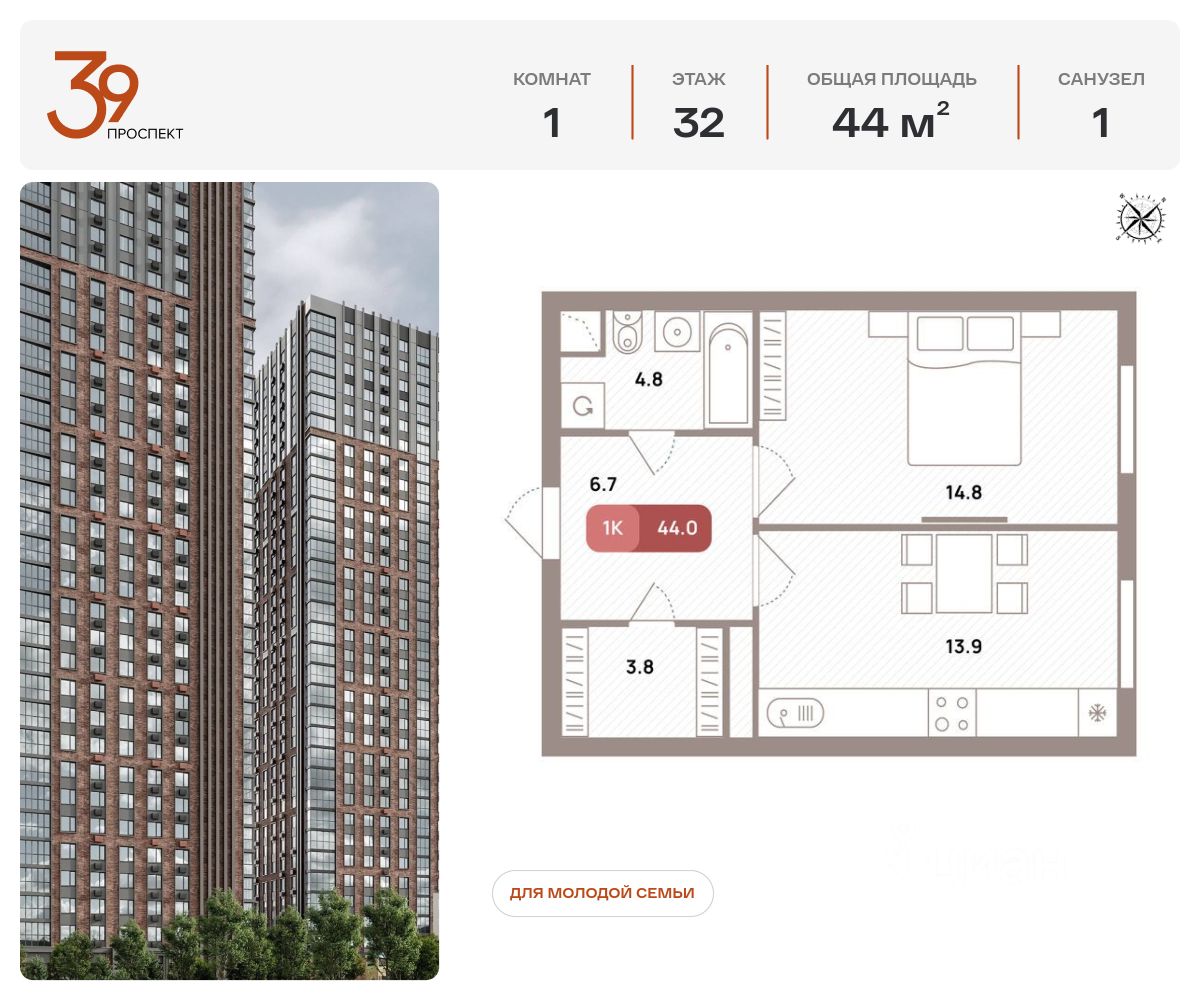 Продается однокомнатная квартира в ЖК "Проспект 39" по адресу Москва, ЮВАО, Рязанский проспект, вл. 39, к. 1. Общая площадь квартиры - 44,00 кв.м., этаж 32. Стоимость квартиры - 18 718 089 р. Продаётся без отделки.