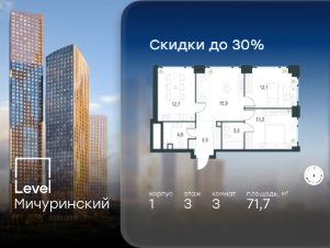 В жилом квартале, расположенном на границе с природным заказником "Долина реки Очаковки", продаётся 3-комнатная квартира площадью 71.70 кв.м без отделки. Квартира расположена на 3 этаже 54-этажного корпуса 1 в жилом комплексе бизнес-класса Level Мичуринский (компания Level Group/Левел групп).