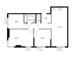 Площадь 84,4 кв.м, максимально возможная для квартир в данном ЖК. Три изолированные комнаты (18,5; 12,8 и 10,8 кв.м) и огромная кухня-гостиная 27,5 кв.м, два санузла (совмещенный ванная + туалет 3,6 кв.м и отдельный туалет 1,3 кв.м).