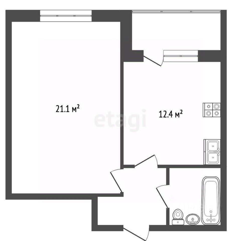 • Просторная комната 21,1 м² и кухня 12,4 м² — удачная планировка с возможностью зонирования