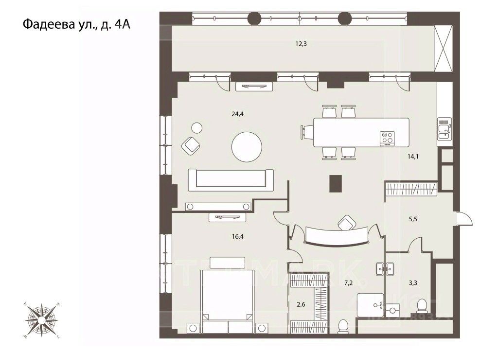 В квартире 5 окон. Предусмотрено одно машино-место в подземном паркинге.