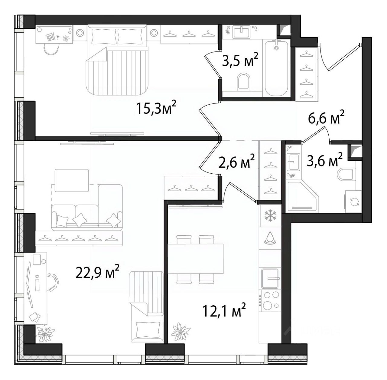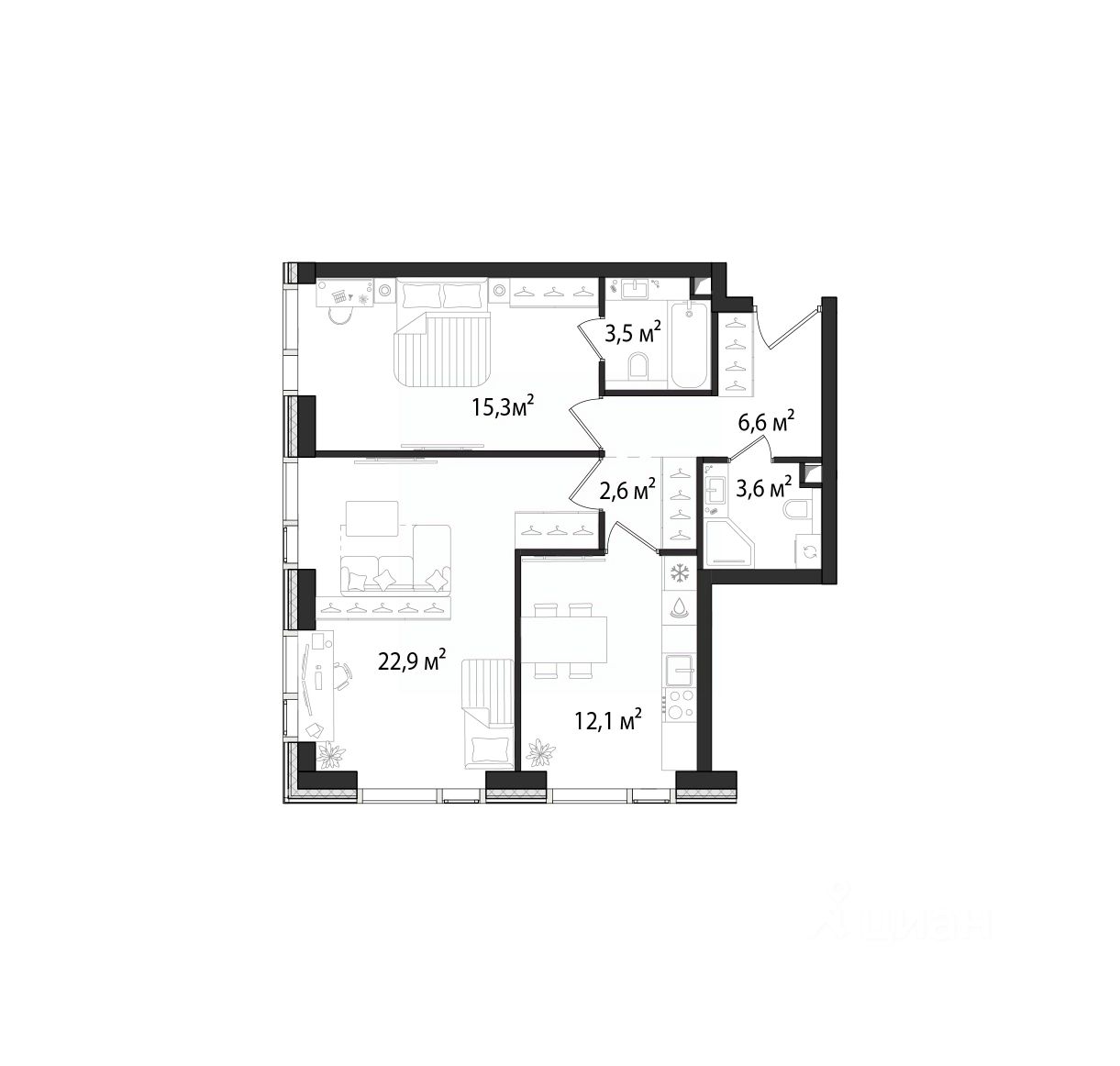 Продаётся 2-комнатная квартира площадью 66,6 м², расположенная на 15 этаже корпуса 2,2.