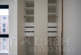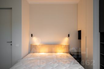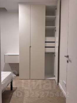 Приватная спальня расположена за дверью скрытого монтаж. Встроенные шкафы наполнены функциональными элементами для хранения.