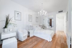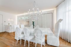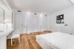 Общая площадь - 206 кв.м, расположена на пятом этаже ЖК Дом над водой. Квартира обладает отличной планировкой: просторная гостиная-столовая с оборудованной кухней, блок с 3 спальнями (две детских и родительская со своей ванной комнатой и гардеробной), балкон, раздельный санузел; отдельно от основного блока организована еще одна спальня (гостевая) со своей душевой комнатой и балконом. Также имеется дополнительная ванная комната и отдельная прачечная со стиральной и сушильной машинами, раковиной и шкафами для хранения. Прихожая меблирована шкафами отдельно для верхней одежды и обуви.