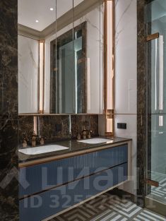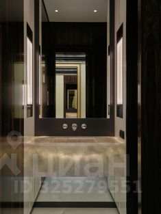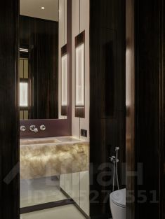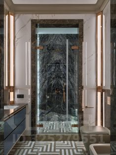 В санузлах использованы кварцит с подсветкой, панно из натурального мрамора и светящиеся колонны в мастер-санузле.