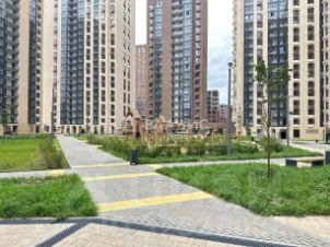 o Сухой фонтан с ночной подсветкой, зоны для прогулок, игр и занятий спортом.