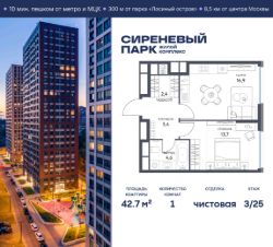 Продаётся просторная 1-комнатная квартира общей площадью 42.7 м² на 3 этаже в новом жилом комплексе "Сиреневый парк", расположенном в Восточном административном округе Москвы на улице Тагильская. Всего 10 минут ходьбы от станции метро "Бульвар Рокоссовского" и одноимённой платформы МЦК.