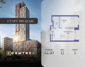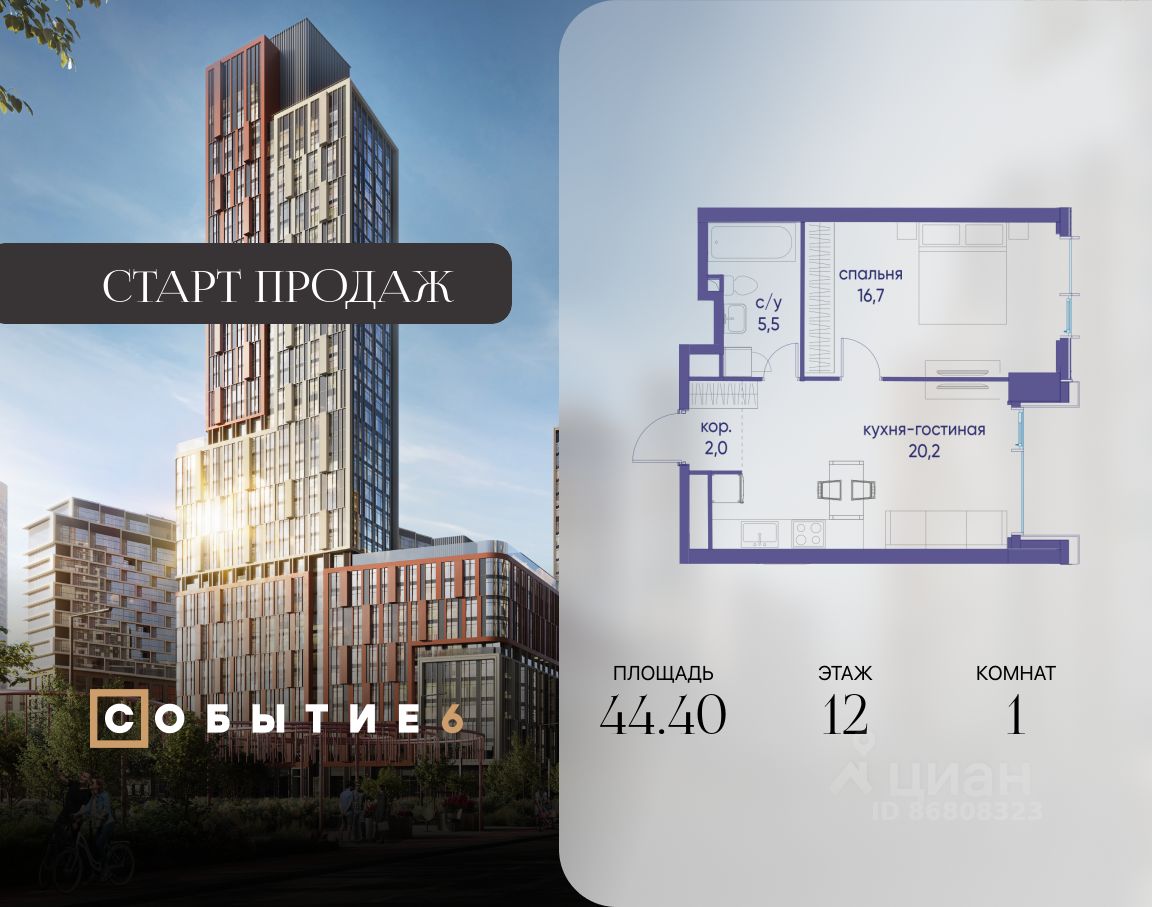 Продаётся 1-комнатная квартира от застройщика: общая площадь 44.40 м², жилая 16.70 м², кухня 20.20 м², 12-й этаж, жилой квартал "Событие-6", корпус 2 (секция 1) Срок сдачи: 1 квартал 2029 года.