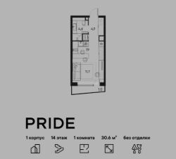 В премиальном жилом квартале PRIDE продается 1 - комнатная квартира - студия в 1 корпусе, на 14 этаже, в секции 10. Её общая площадь составляет 30.6 м². Пространство включает зону для отдыха 11,7 м², уютную кухню 7,9 м², и ванную комнату 4,6 м². Ключи в 2026 году.