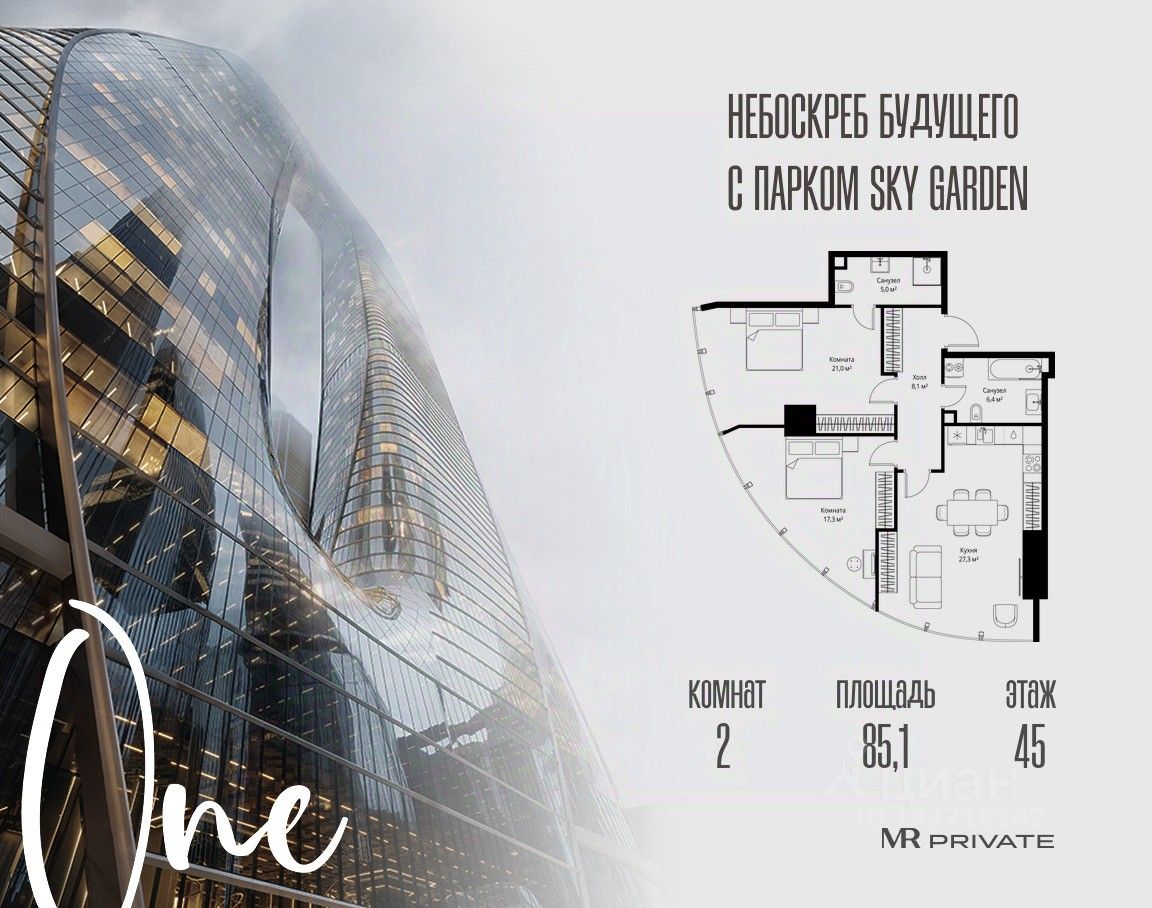 В продаже 2-комнатная квартира площадью 85.10 м² на 45-м этаже.