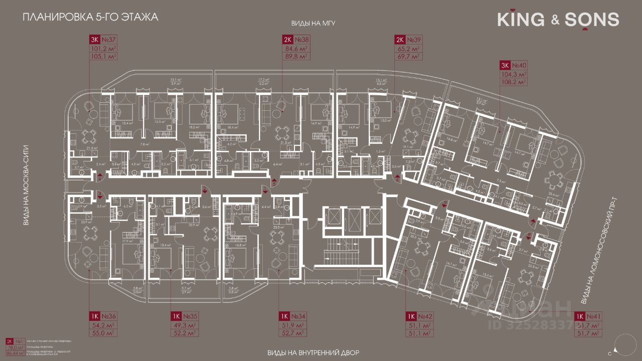KING & SONS это клубный дом на 117 резиденций премиум-класса, расположенный на престижной и исторической улице Мосфильмовская. Из большинства квартир открываются панорамные виды на МГУ, "Москву-Сити", особняки посольств и парки. Это место для тех, кто не хочет выбирать между комфортом мегаполиса и уединением на природе. Проект разработан японским архитектурным бюро NIKKEN. Фасады из натурального камня, мягкие формы здания, максимально открытое остекление, окна в пол — все это делает облик здания выразительным и уникальным. В проекте предусмотрено 70% квартир с террасами. Потолки от 3,2 до 4,7 м. Паркинг на 110 машиномест. Для будущих резидентов продуманы разнообразные общественные пространства зимний сад в лобби первого этажа, секретный сад с зоной открытого огня, лаундж-зона с кинотеатром на крыше, собственный спортзал, зоны для занятий йогой и медитацией. KING & SONS это фамильная недвижимость, которую с гордостью передают по наследству, как искусство и бриллианты.