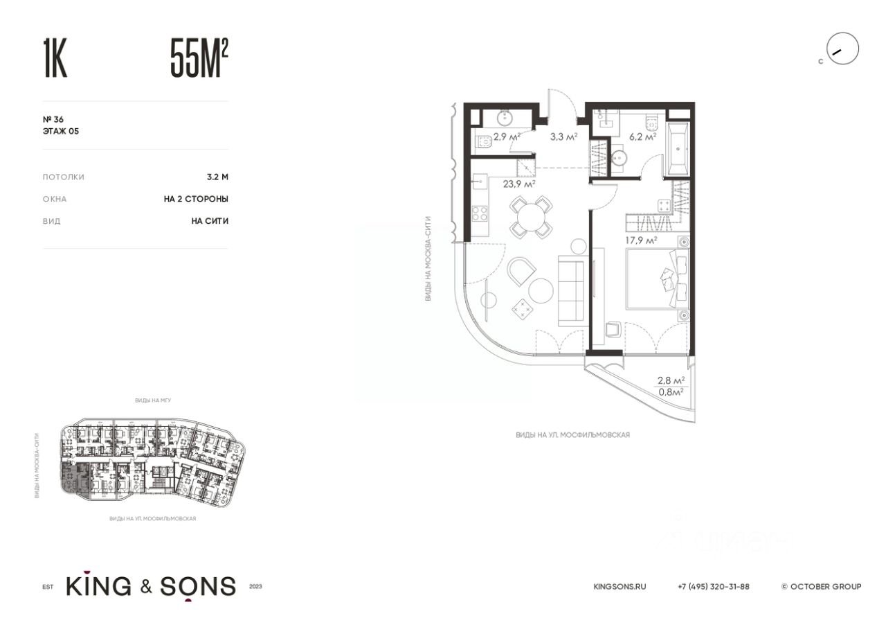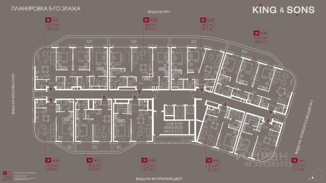 KING & SONS это клубный дом на 117 резиденций премиум-класса, расположенный на престижной и исторической улице Мосфильмовская. Из большинства квартир открываются панорамные виды на МГУ, "Москву-Сити", особняки посольств и парки. Это место для тех, кто не хочет выбирать между комфортом мегаполиса и уединением на природе. Проект разработан японским архитектурным бюро NIKKEN. Фасады из натурального камня, мягкие формы здания, максимально открытое остекление, окна в пол — все это делает облик здания выразительным и уникальным. В проекте предусмотрено 70% квартир с террасами. Потолки от 3,2 до 4,7 м. Паркинг на 110 машиномест. Для будущих резидентов продуманы разнообразные общественные пространства зимний сад в лобби первого этажа, секретный сад с зоной открытого огня, лаундж-зона с кинотеатром на крыше, собственный спортзал, зоны для занятий йогой и медитацией. KING & SONS это фамильная недвижимость, которую с гордостью передают по наследству, как искусство и бриллианты.