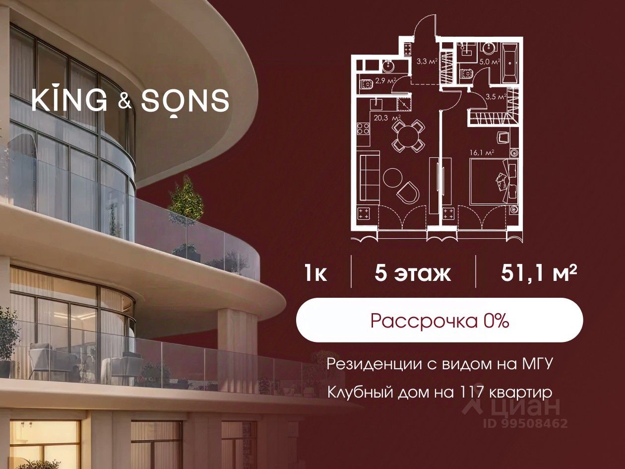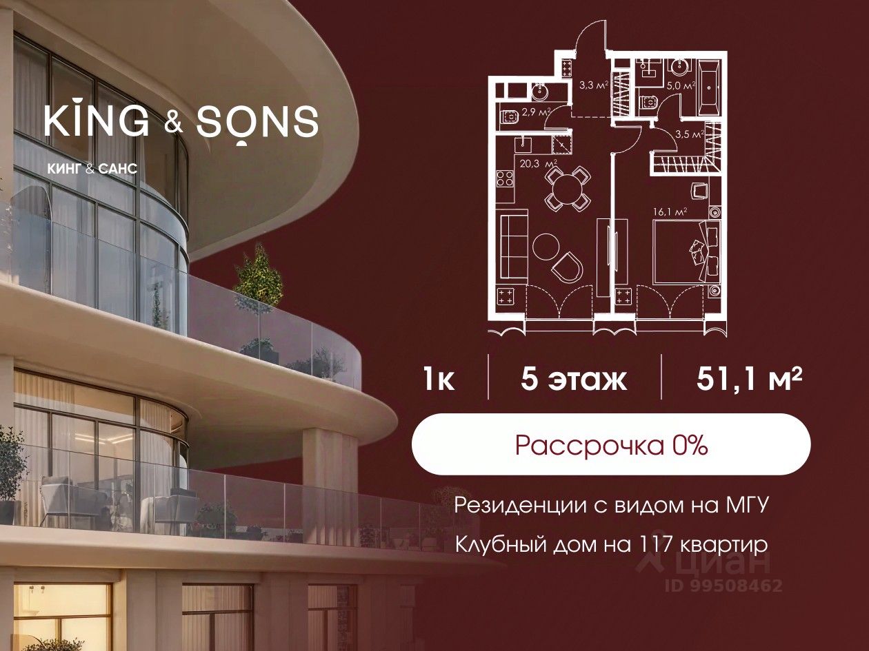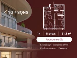 КИНГ энд САНС это клубный дом на 117 резиденций премиум-класса, расположенный на престижной и исторической улице Мосфильмовская. Из большинства квартир открываются панорамные виды на МГУ, "Москву-Сити", особняки посольств и парки. Это место для тех, кто не хочет выбирать между комфортом мегаполиса и уединением на природе. Проект разработан международным архитектурным бюро, которое входит в ТОП-2 в мире. Фасады из натурального камня, мягкие формы здания, максимально открытое остекление, окна в пол — все это делает облик здания выразительным и уникальным. В проекте предусмотрено 70% квартир с террасами. Потолки от 3,2 до 4,7 м. Паркинг на 110 машиномест. Для будущих резидентов продуманы разнообразные общественные пространства зимний сад в лобби первого этажа, секретный сад с зоной открытого огня, лаундж-зона с кинотеатром на крыше, собственный спортзал, зоны для занятий йогой и медитацией. КИНГ энд САНС это фамильная недвижимость, которую с гордостью передают по наследству