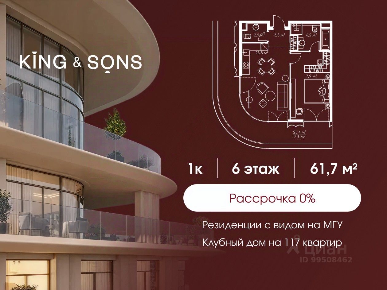 KING & SONS это клубный дом на 117 резиденций премиум-класса, расположенный на престижной и исторической улице Мосфильмовская. Из большинства квартир открываются панорамные виды на МГУ, "Москву-Сити", особняки посольств и парки. Это место для тех, кто не хочет выбирать между комфортом мегаполиса и уединением на природе. Проект разработан международным архитектурным бюро, которое входит в ТОП-2 в мире. Фасады из натурального камня, мягкие формы здания, максимально открытое остекление, окна в пол — все это делает облик здания выразительным и уникальным. В проекте предусмотрено 70% квартир с террасами. Потолки от 3,2 до 4,7 м. Паркинг на 110 машиномест. Для будущих резидентов продуманы разнообразные общественные пространства зимний сад в лобби первого этажа, секретный сад с зоной открытого огня, лаундж-зона с кинотеатром на крыше, собственный спортзал, зоны для занятий йогой и медитацией. KING & SONS это фамильная недвижимость, которую с гордостью передают по наследству