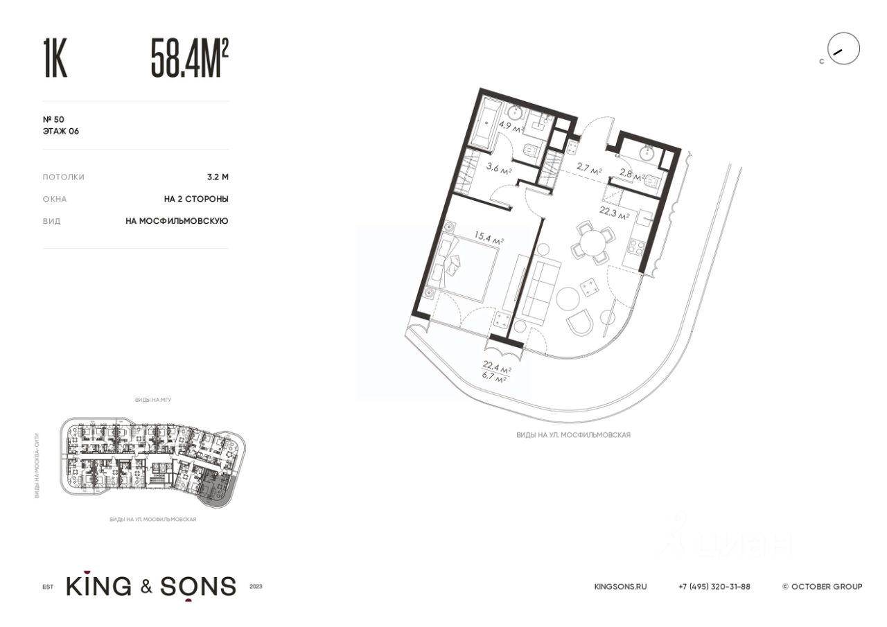 KING & SONS это клубный дом на 117 резиденций премиум-класса, расположенный на престижной и исторической улице Мосфильмовская. Из большинства квартир открываются панорамные виды на МГУ, "Москву-Сити", особняки посольств и парки. Это место для тех, кто не хочет выбирать между комфортом мегаполиса и уединением на природе. Проект разработан японским архитектурным бюро NIKKEN. Фасады из натурального камня, мягкие формы здания, максимально открытое остекление, окна в пол — все это делает облик здания выразительным и уникальным. В проекте предусмотрено 70% квартир с террасами. Потолки от 3,2 до 4,7 м. Паркинг на 110 машиномест. Для будущих резидентов продуманы разнообразные общественные пространства зимний сад в лобби первого этажа, секретный сад с зоной открытого огня, лаундж-зона с кинотеатром на крыше, собственный спортзал, зоны для занятий йогой и медитацией. KING & SONS это фамильная недвижимость, которую с гордостью передают по наследству, как искусство и бриллианты.