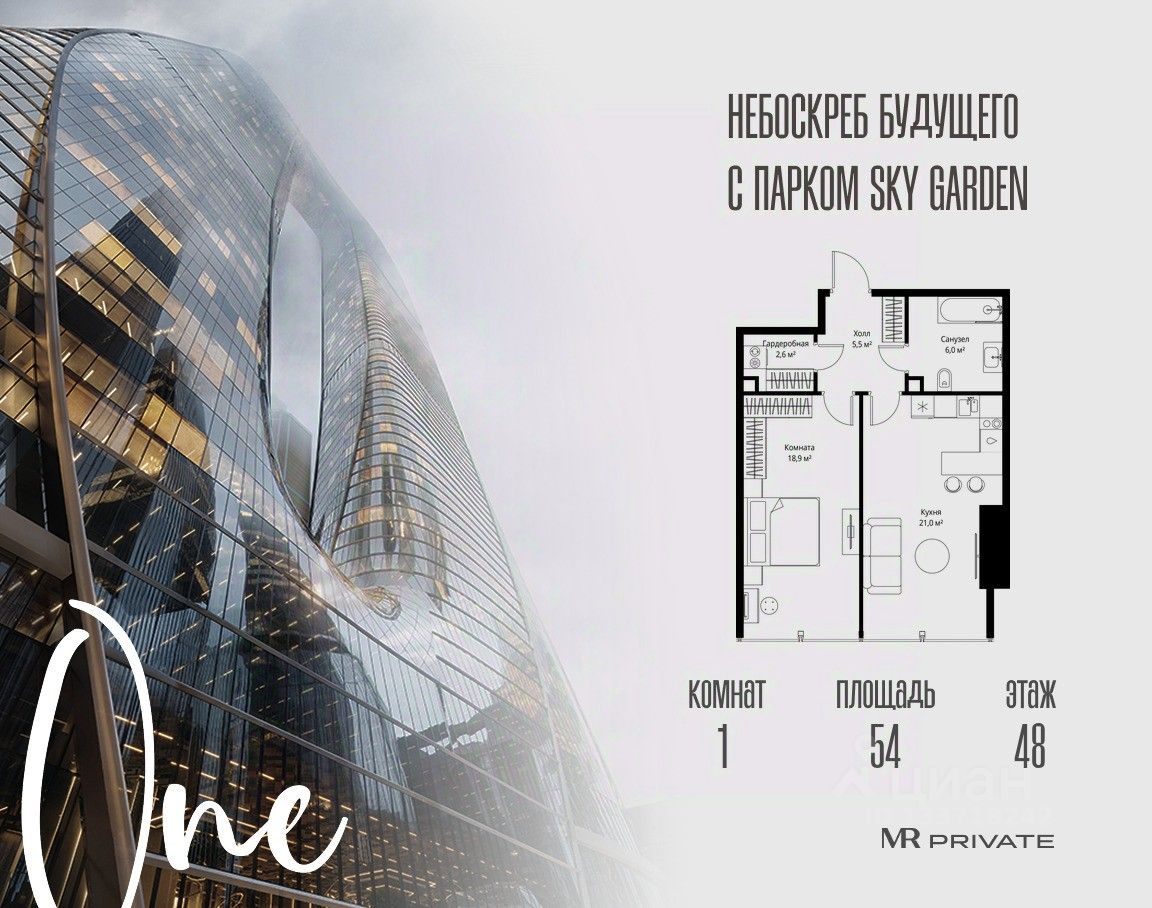 В продаже 1-комнатная квартира площадью 54.00 м² на 48-м этаже.