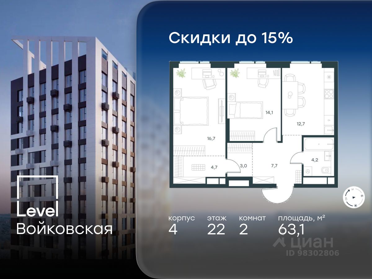 Продается 2-комнатная квартира площадью 63.10 кв. м с отделкой. Квартира находится на 22 этаже 26-этажного корпуса 4, в новом жилом комплексе бизнес-класса Level Войковская, расположенном рядом с живописным заповедником "Покровское-Стрешнево" (застройщик - компания Level Group/Левел групп).