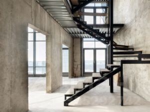 Лестница из металлического каркаса — архитектурная доминанта, изящно связывающая все уровни.