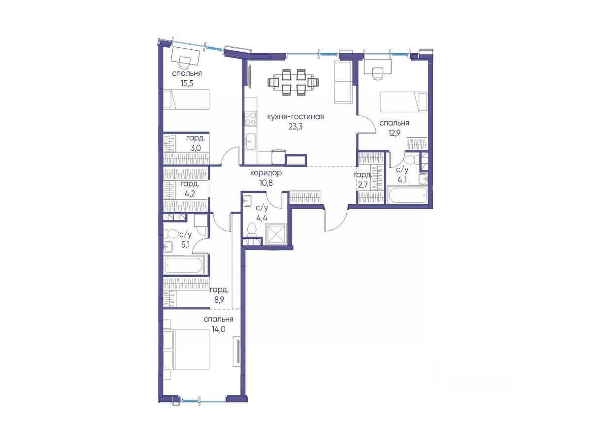 Продаётся 3-комнатная квартира от застройщика: общая площадь 108.90 м², жилая 42.40 м², кухня 23.30 м², 5-й этаж, жилой квартал "Событие-6", корпус 2 (секция 4) Срок сдачи: 1 квартал 2029 года.