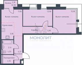 ЭРГОНОМИЧНАЯ ПЛАНИРОВКА: кухняниша 5,96 м², жилая зона 40,86 м², прихожая 6,37 м², коридор 5,90 м², санузел 4,59 м², постирочная 2,72 м², балкон 2,35 м²;