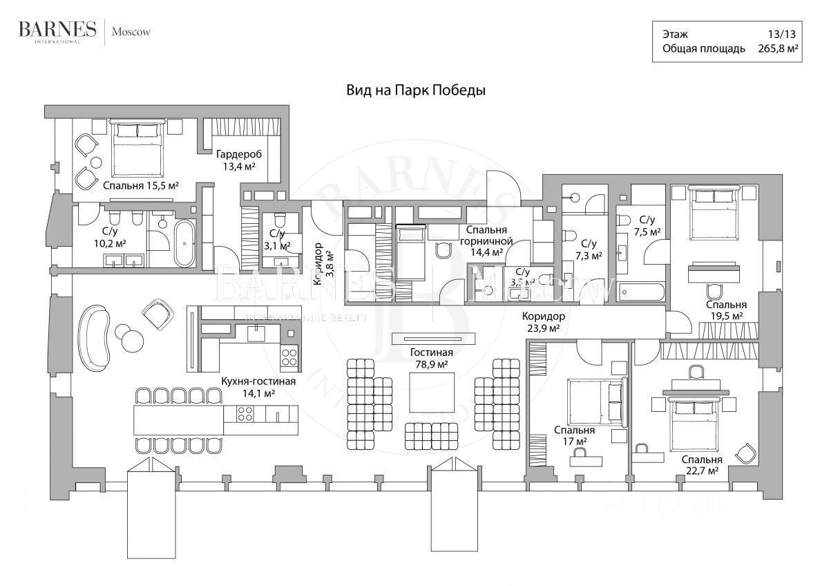 резиденция расположена на верхнем этаже; панорамные окна открывают захватывающие виды на закрытый благоустроенный двор Victory Garden и Парк Победы.