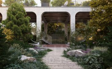 Два корпуса соединяет галерея, которая формирует двухуровневое пространство приватного атриумного двора, обустроенного садом с дорожками из натурального камня, зоной для тренировок на открытом воздухе, местами для отдыха и работы. Под галереей размещена парадная гостиная.