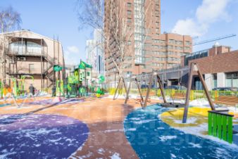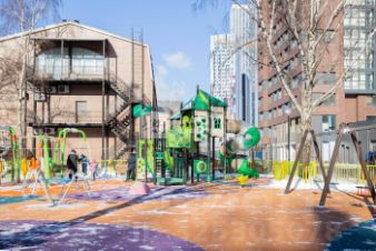 - Рядом Москва-река, есть зеленая прогулочная зона вдоль набережной и парк.