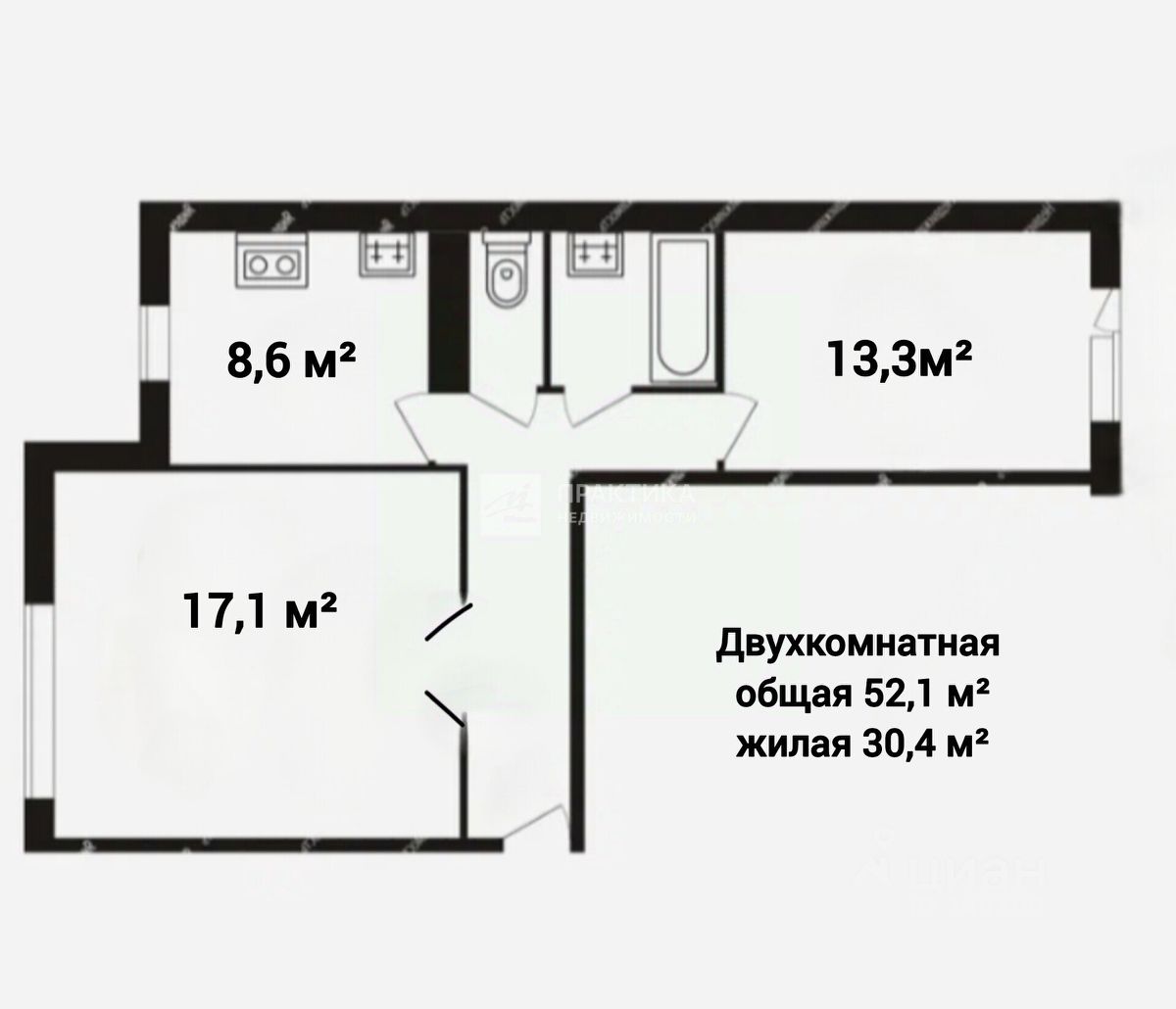 Общая площадь составляет 52 кв. м, из которых 30,5 кв. м — жилая площадь.